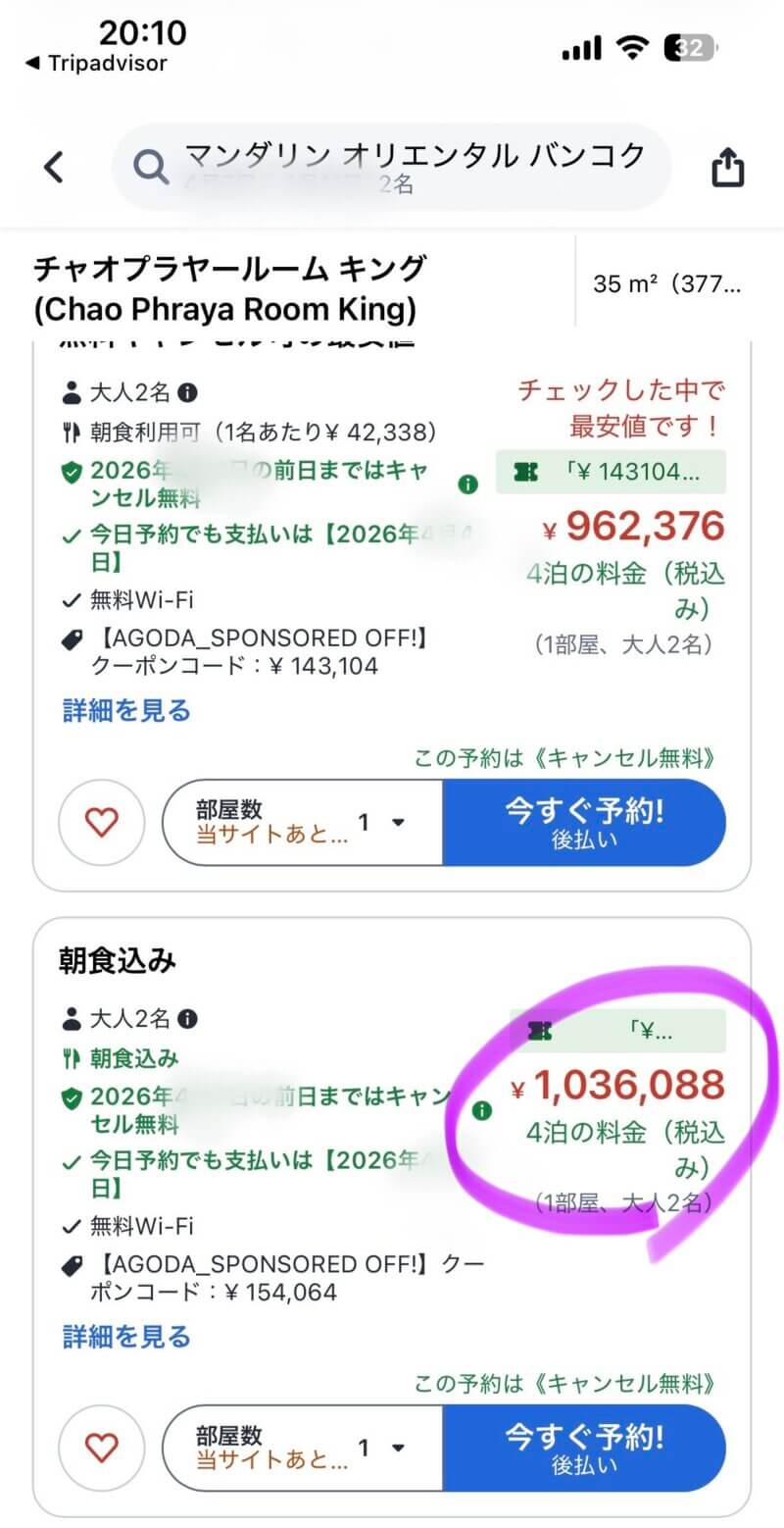今回ハワイのホノルルで4泊の予定だが、かつてママ友と泊まったマンダリンオリエンタル・バンコクの1番低いスタンダードカテゴリーに同時期に4泊したらいくらぐらいするか調べてみた。ちなみにわたしたちが泊まったのは、デラックススイートだったので、更に高くなる(^_^;)