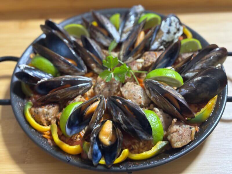 ムール買があったので、本当はエビなどを添えてシーフードパエリアでも良かったのだが、同じく冷凍庫に眠っていたサルシッチャのタネを使ってミックスパエリアにしてみた。