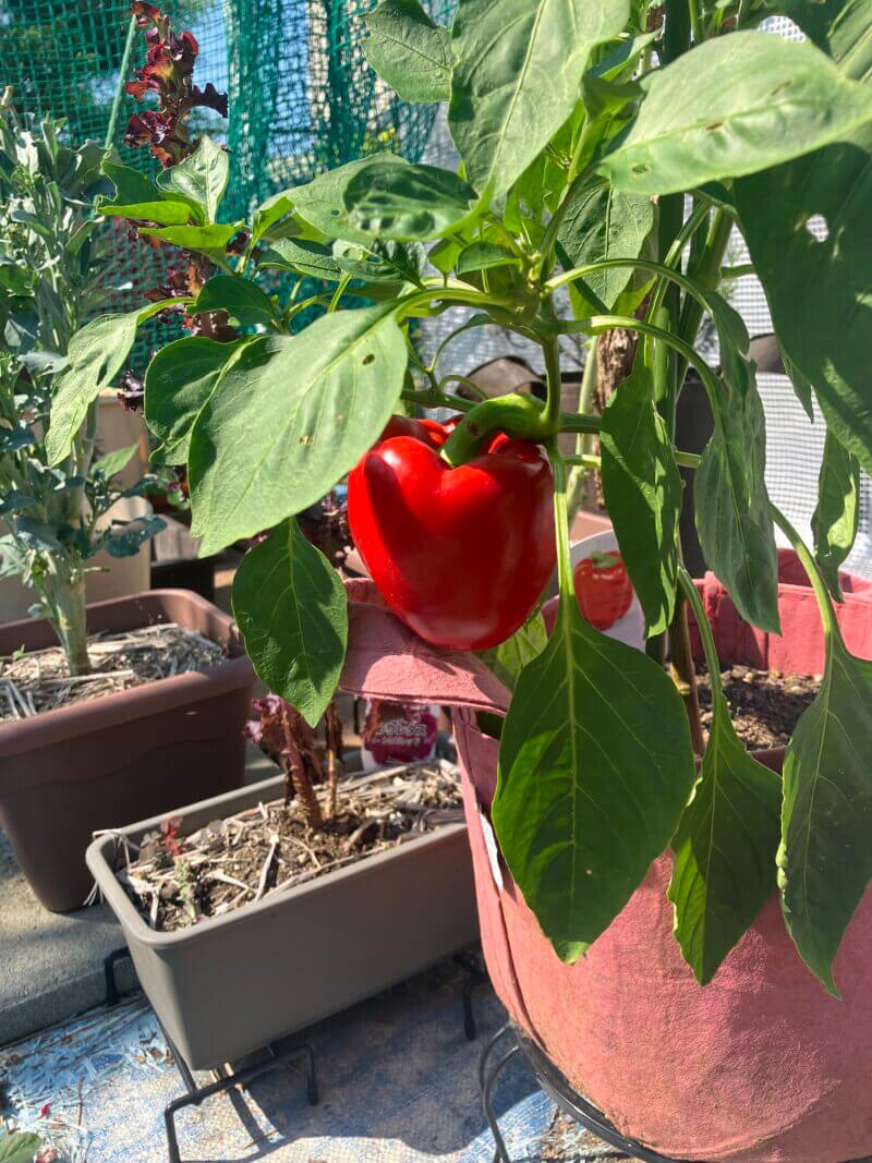 今朝はパプリカの収穫をした。トマトに負けないくらいとても美しい赤。