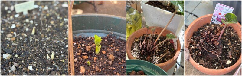 向かって左からサフラン、ラナンキュラス・ラックス・ディーバ、ドライ法で夏越ししたガーデンシクラメン・ジックスたち、管理さえ間違えなければ、毎年繰り返し芽吹いてくれる球根植物たちだ。