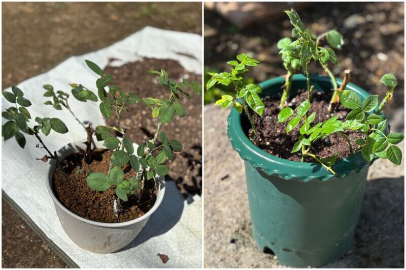 先日挿し穂から育てた赤い薔薇が咲いたが、同時期に保険で貰った朱色の薔薇の挿し穂も十分発根してきたのでバラ鉢に植え替えた。