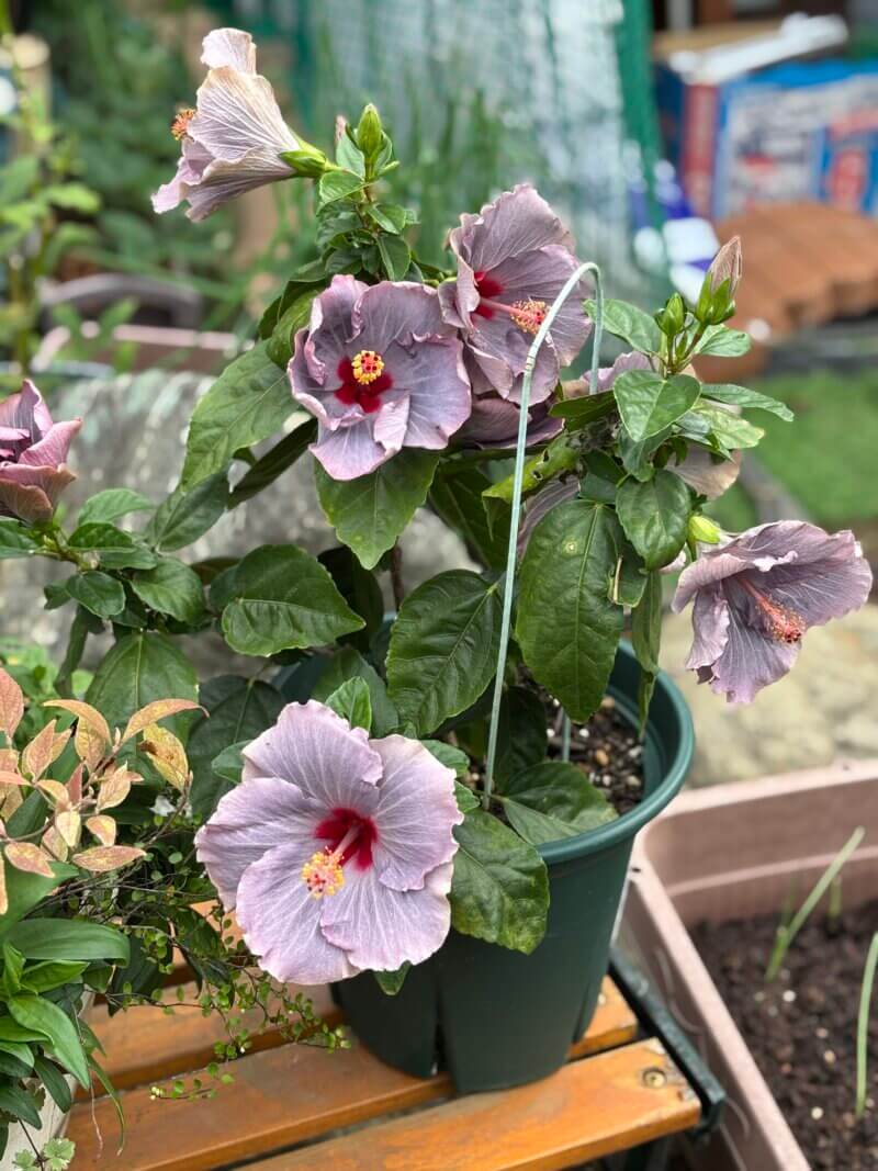 そしてもう11月に入ったというのに、鉢植えのハイビスカスがてんこ盛りに咲いている。ただこのハイビスカス、今流行りの「くすみカラー」なので、そこまで場違い感がないのが嬉しいところ。