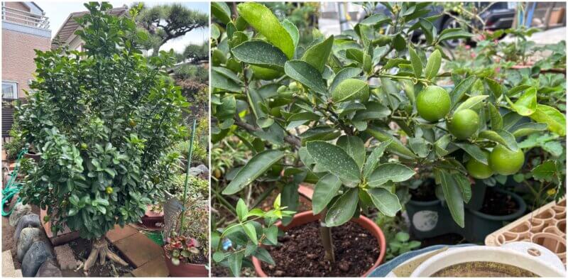 そして柑橘系も。向かって左から、金柑、ライムである。ライムはそろそろ収穫しても良さそう。金柑はまだまだかしら。