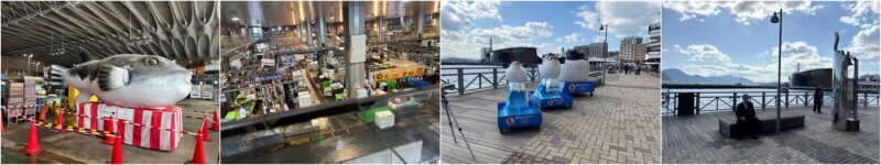 正直なところ、朝ラウンジでシェアして食べたジャンボおにぎりとお弁当、ビールでそれほどお腹が空いていた訳でもなく、2日目のお宿の夕食で「ふぐ会席」を予約しているので、市場内を散策して雰囲気を楽しむだけで満足。