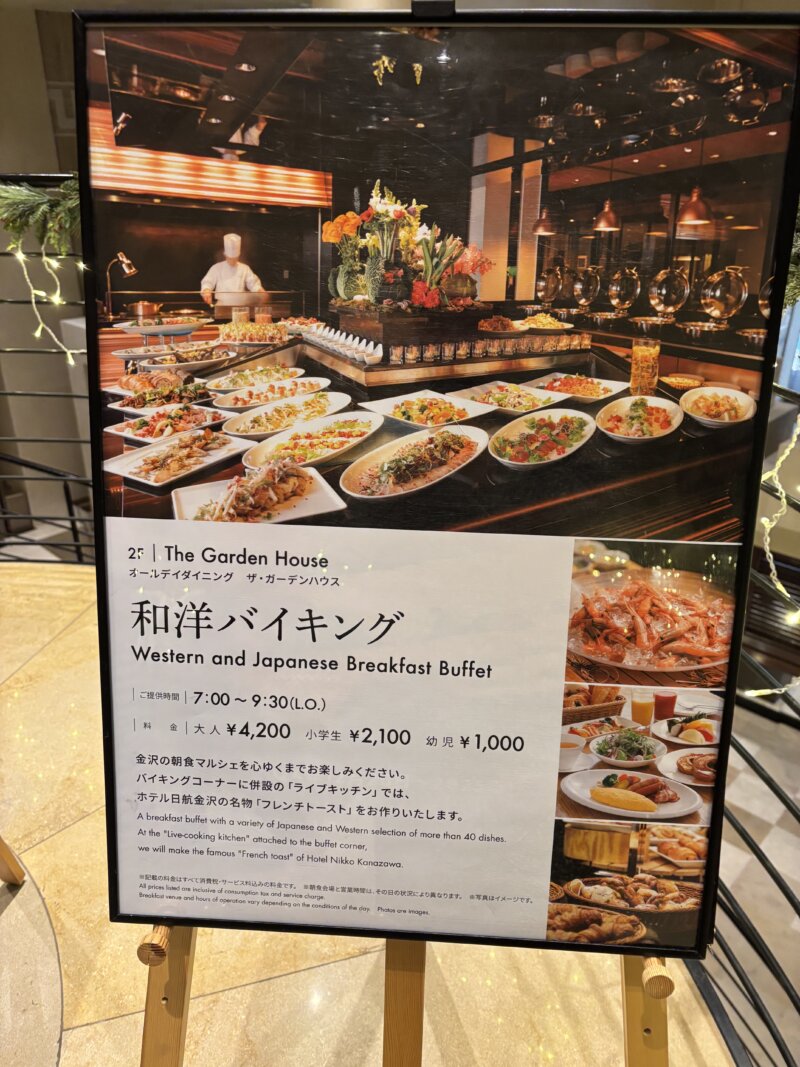 地物食材を使用し、金沢の郷土料理をはじめとした和洋バイキングだ。宿泊客以外でも大人4,200円、小学生2,100円、幼児1,000円で利用可。
