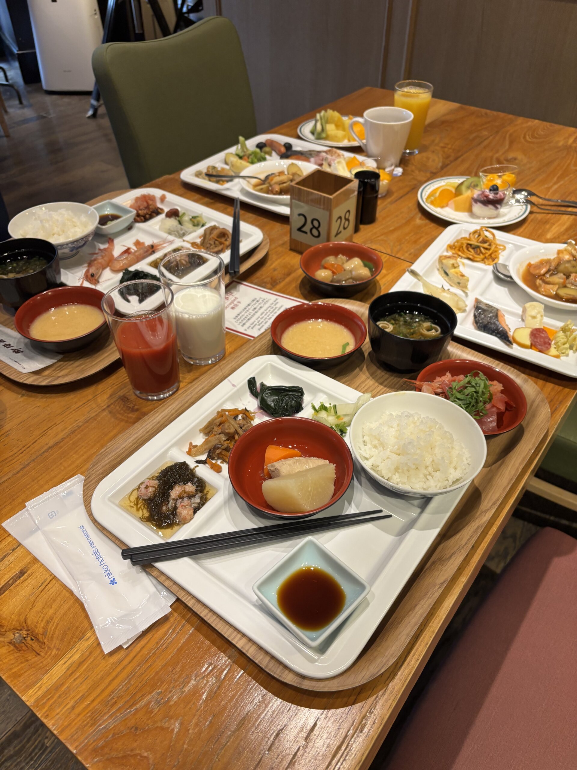 これは自分たちが食べたものだけなので、この他、お粥、カレー、クラムチャウダー、パン各種、サラダバー、ハム、ウインナーなど定番メニューも充実。ライブキッチンでは、オムレツと車麩のフレンチトースト等も提供されていた。